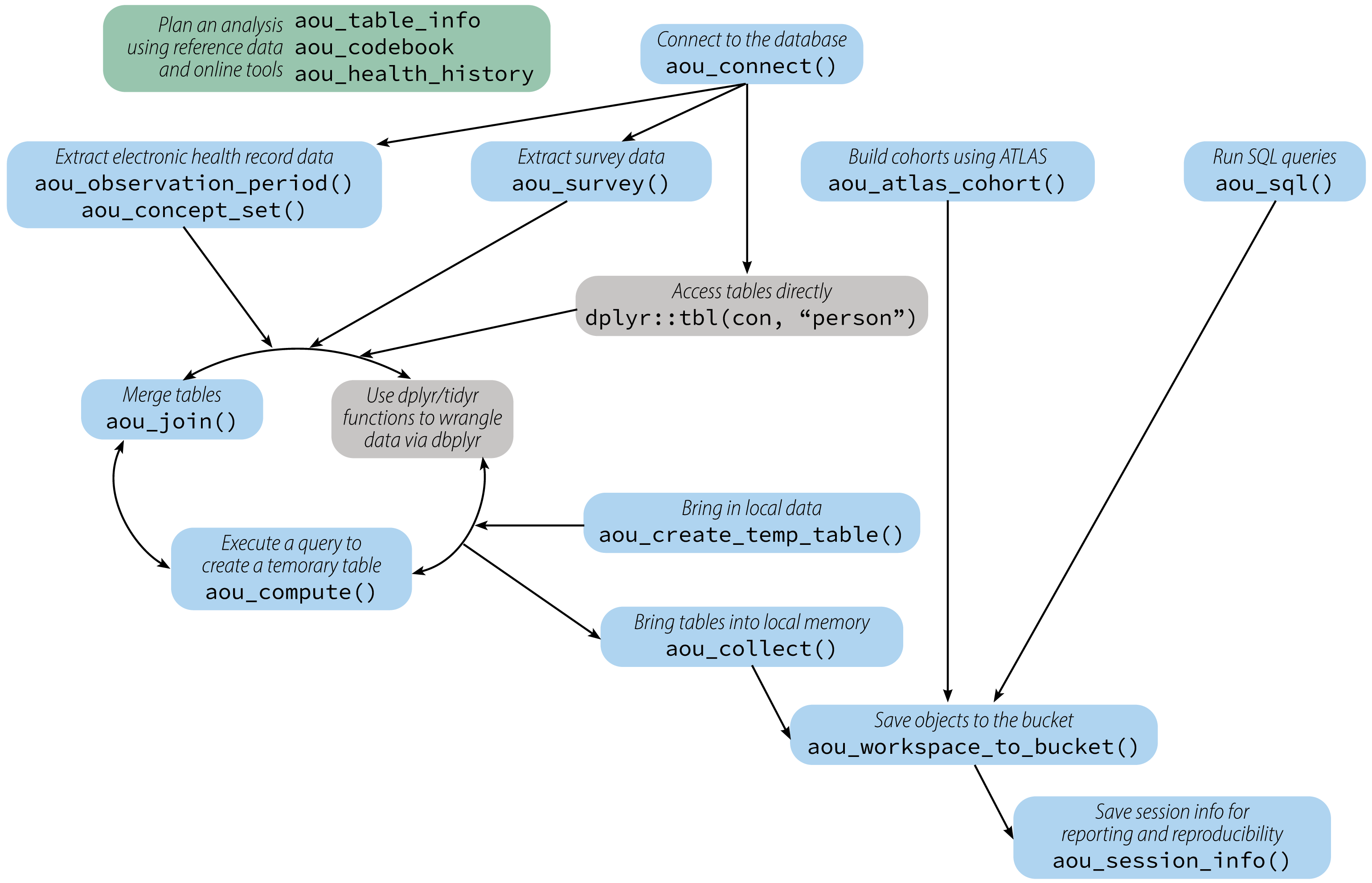 allofus package allows users to mostly avoid SQL and use the popular tidyverse R frameworkallofus package allows for simpler methods of cohort and outcomes specification using the OMOP CDM data, including survey data in All of Usallofus package helps try to avoid (some) mistakes and make code intent clear