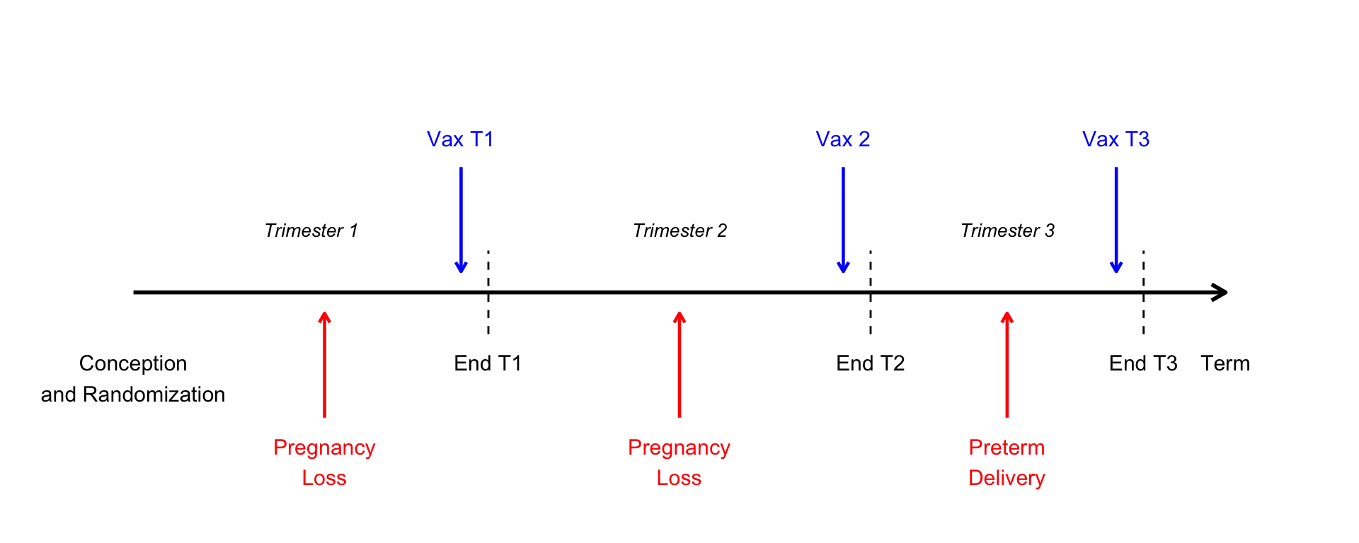 We are simplifying things by assuming vaccination happens at the end of a trimester, after any pregnancy losses
