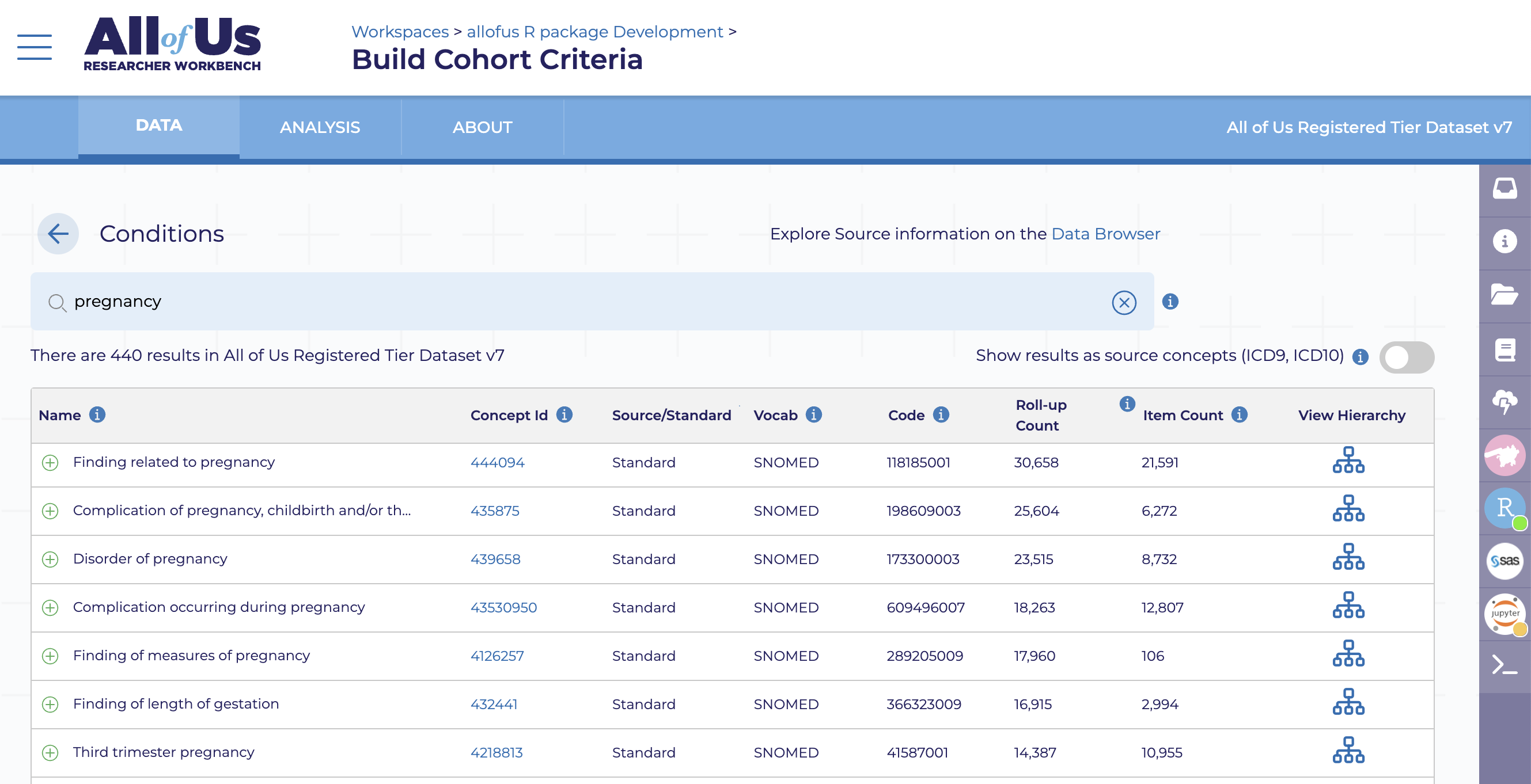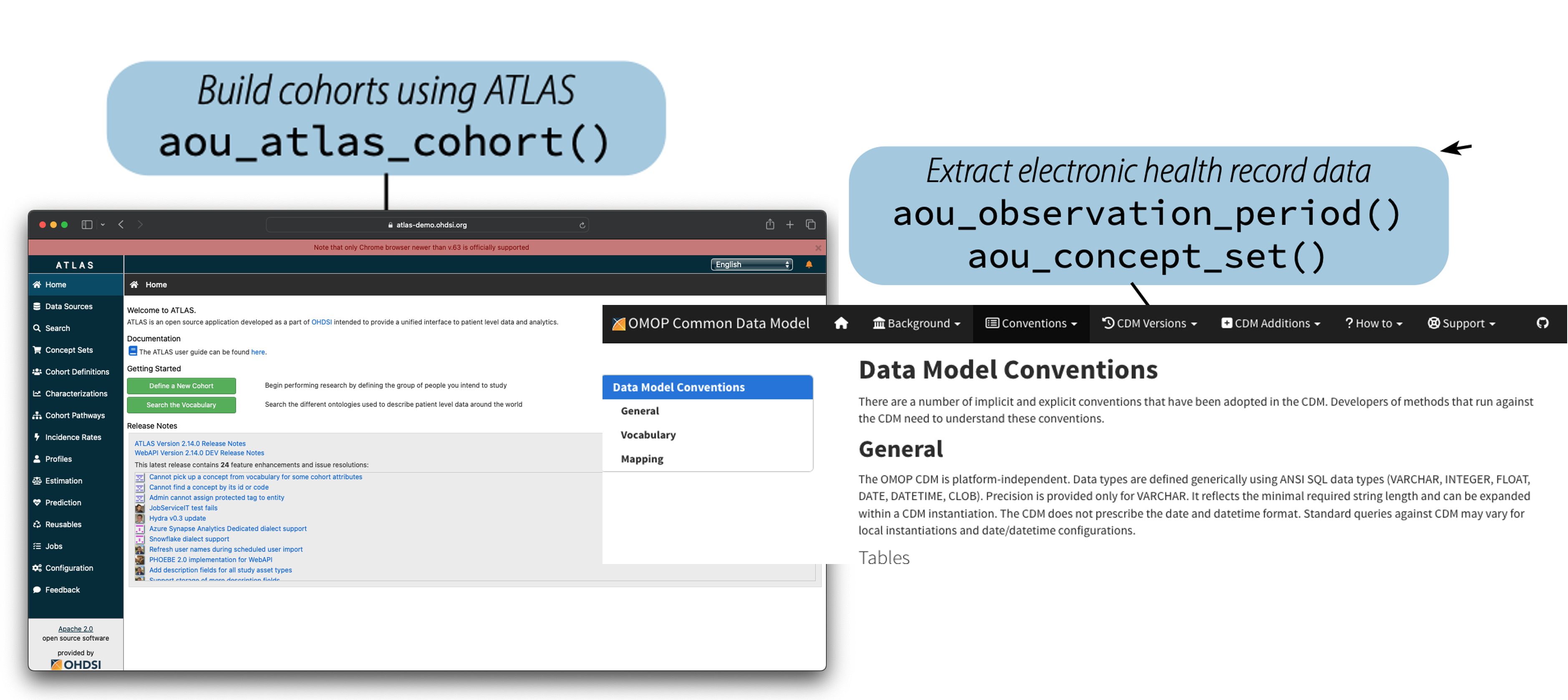 allofus package allows users to mostly avoid SQL and use the popular tidyverse R frameworkallofus package allows for simpler methods of cohort and outcomes specification using the OMOP CDM data, including survey data in All of Usallofus package helps try to avoid (some) mistakes and make code intent clear