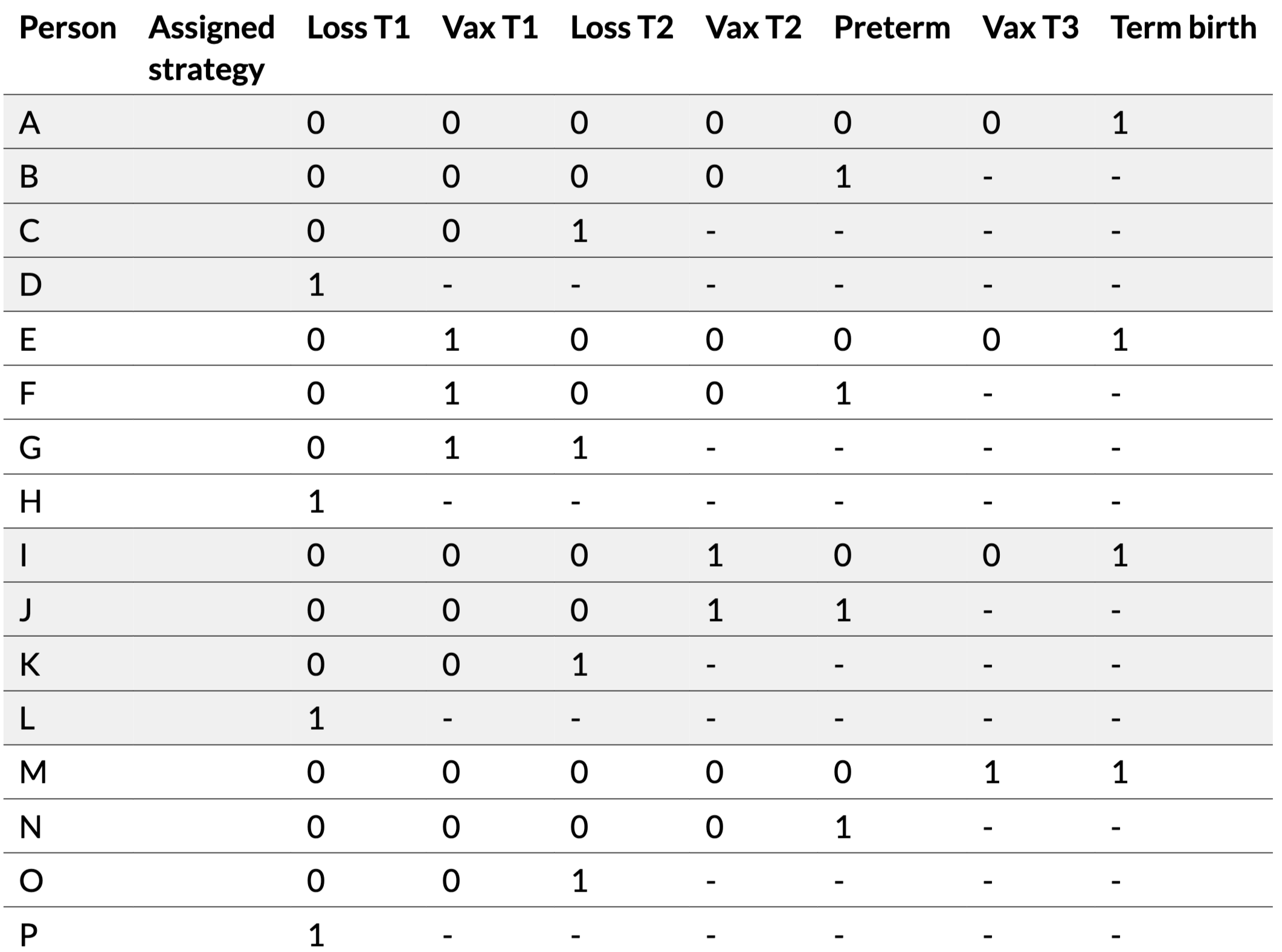 | Person | Assigned strategy | Loss T1 | Vax T1 | Loss T2 | Vax T2 | Preterm | Vax T3 | Term birth | Live birth |