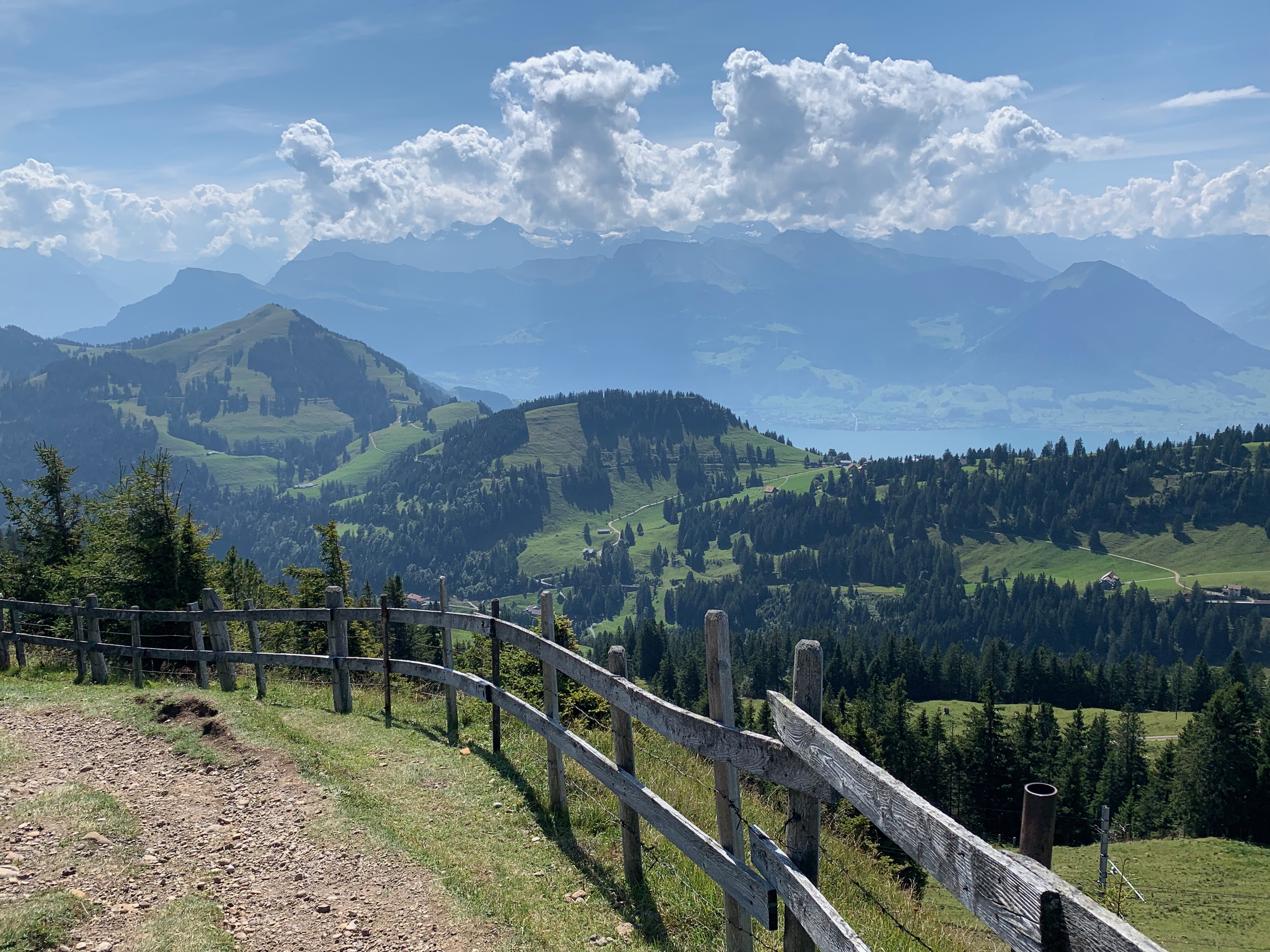 This was probably my most extensive day of transit, with only a short hike segment. I took the train to Lucerne, then a ferry to Weggis, and walked through town to take a cable car to Rigi Kaltbad (this one is included on the GA travelcard!). From there I hiked up to Rigi Kulm, the summit of Mount Rigi. The excitement up there was the cog railway down to Arth-Goldau. I sat next to a little boy who was a train fanatic (see his hat in the photos) and from whom I learned the German word for train (“Zug”). (I have also now learned that the Mount Washington Cog Railway was the first in the world, but the first one in continental Europe, a couple of years later, was to Rigi Kulm.) I then took a train to Flüelen, and from there a ferry back to Lucerne. The ferry ride was incredible—I felt like I was on Lake Como (where I’ve never been…).